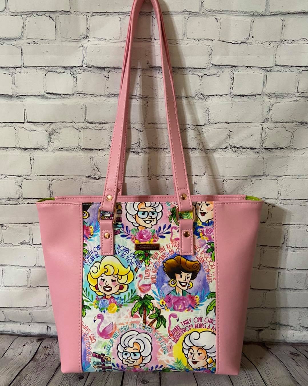 This pretty handbag is a perfect everyday carry! Featuring our favorite Golden ladies and their crazy phrases. The long straps are perfect for shoulder or arm crook carrying. The exterior of the bag features pink faux leather, rose gold hardware and one exterior slip pocket. The inside is lined with lime green waterproof canvas, its sturdy and vibrant. Also inside are two slip pockets and one zipper pocket. Snatch it up while you can!