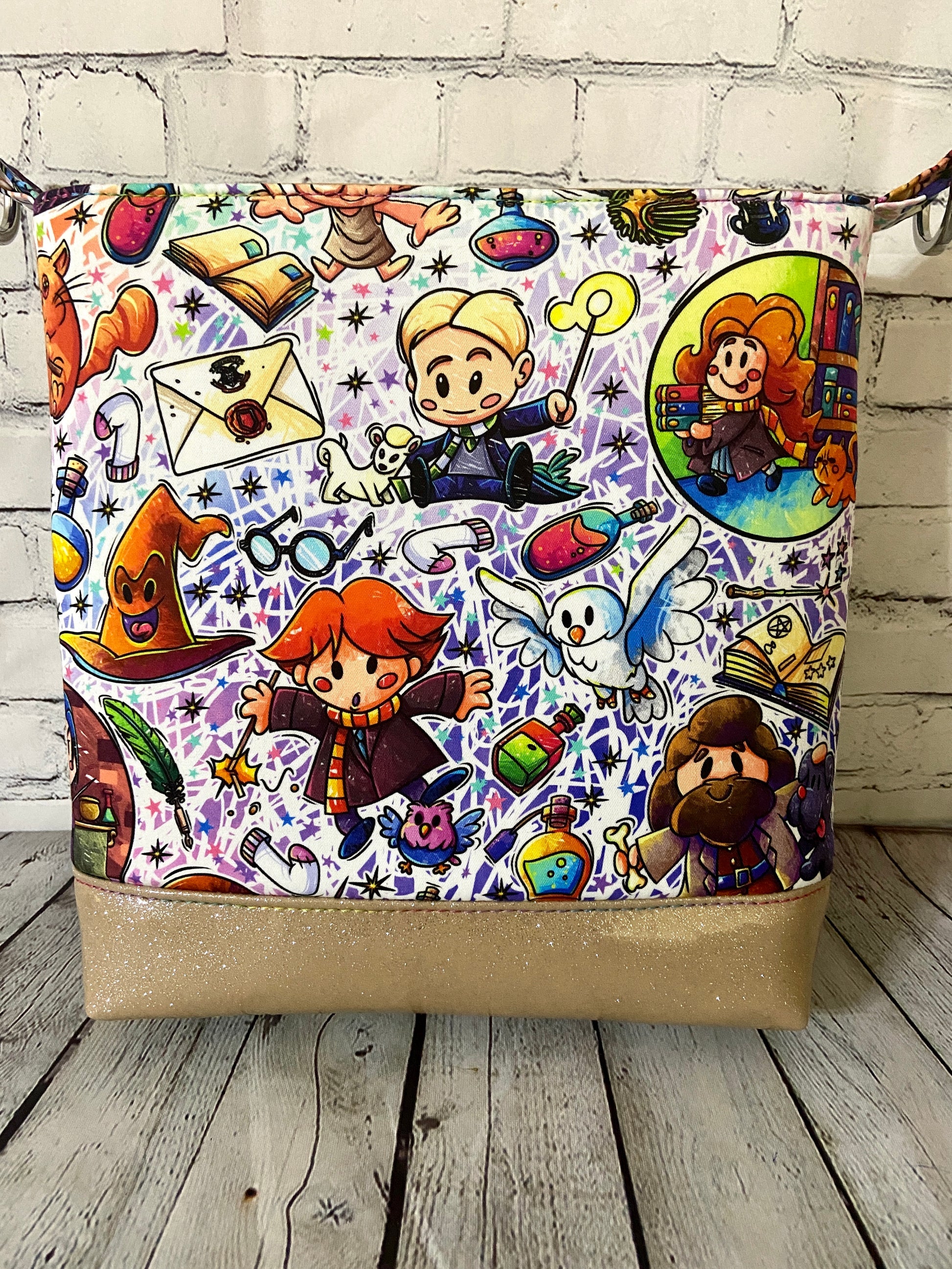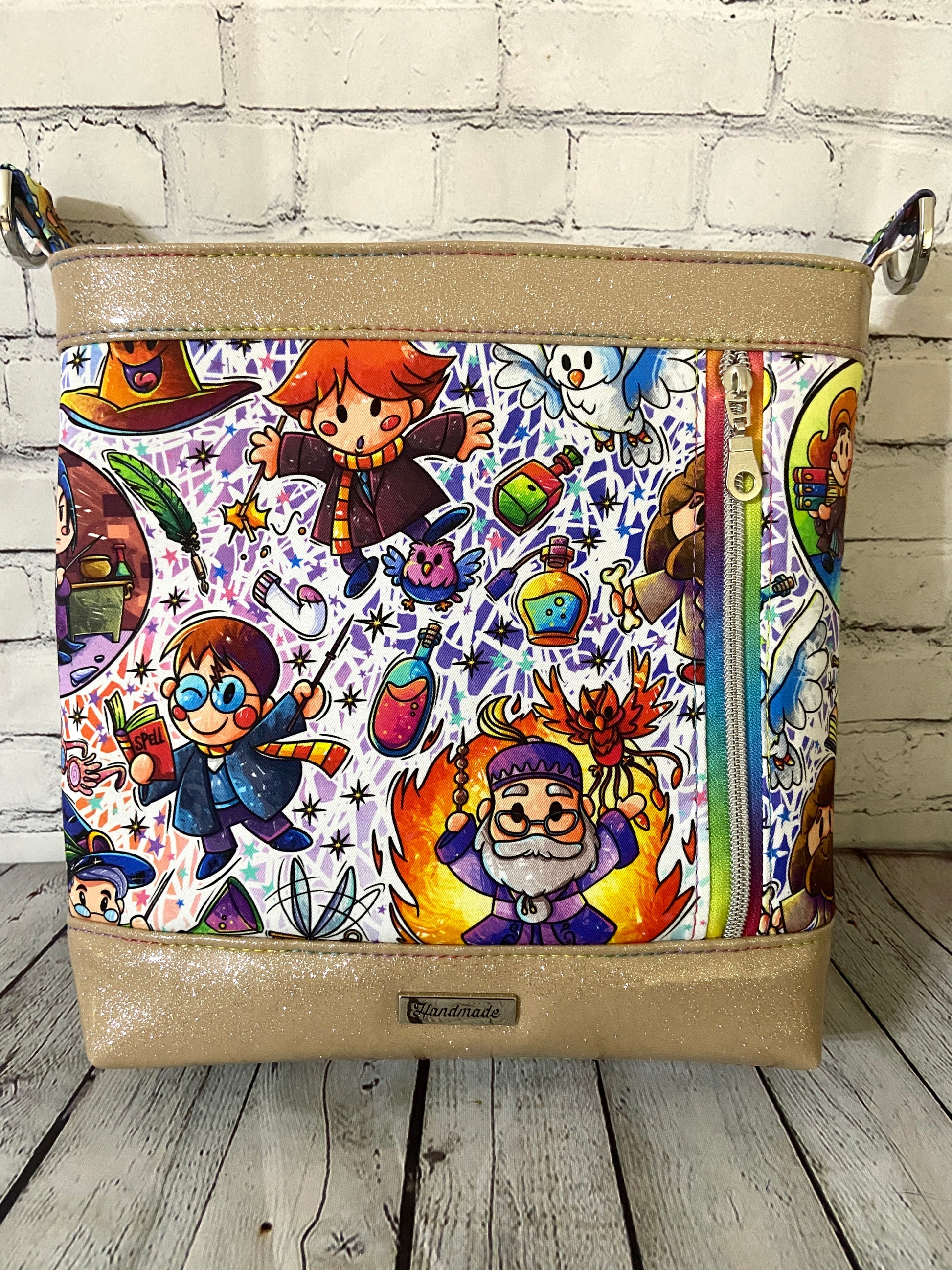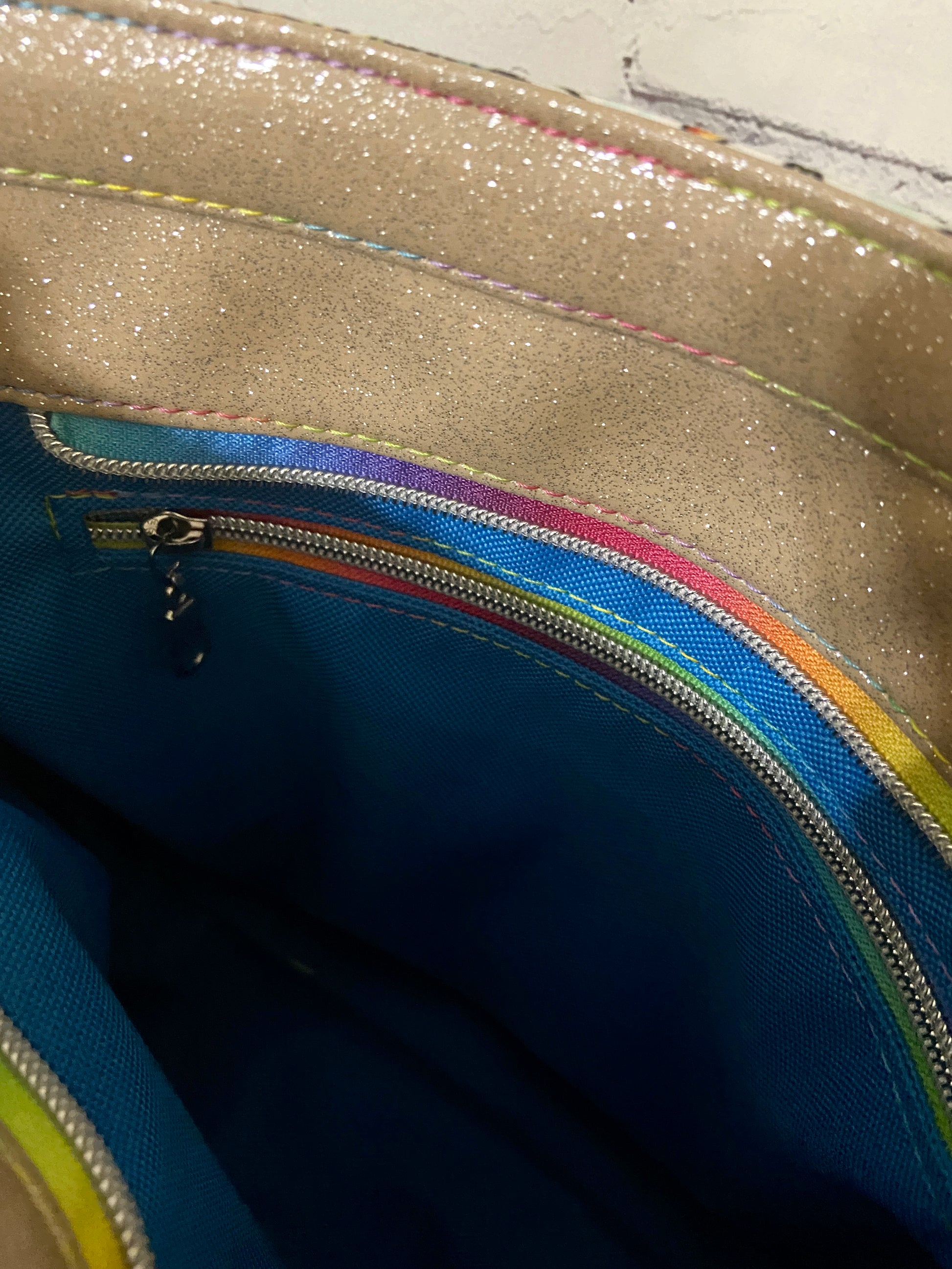 This fun HP crossbody bag is the perfect size for everyday carrying! This bag features tan glitter vinyl, silver hardware and rainbow zipper tape. It is lined inside with a gorgeous blue waterproof canvas. One horizontal zipper pocket on the outside and one standard zipper pocket on the inside. Belamour by Bagstock.