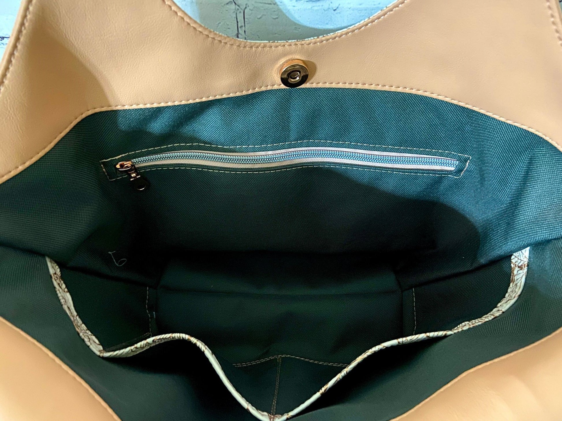 This handbag features peach colored faux leather paired with a lovely floral print and is lined inside with charcoal colored waterproof canvas. Waterproof canvas is a fantastic material, no more holes or dirty purse linings, simple wipe with a damp cloth if needed. Features rose gold hardware, an exterior zipper pocket, two interior slip pockets and one interior zipper pocket. Closes with a magnetic snap. This spacious tote is all around a comfortable carry! Pattern: Tiger Lily by SewFlo Sewing