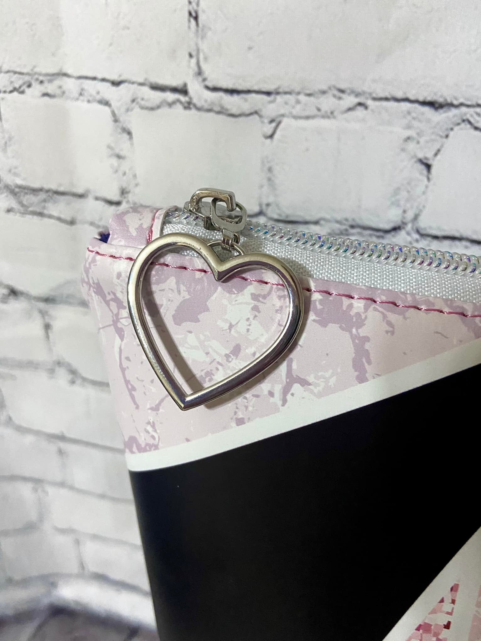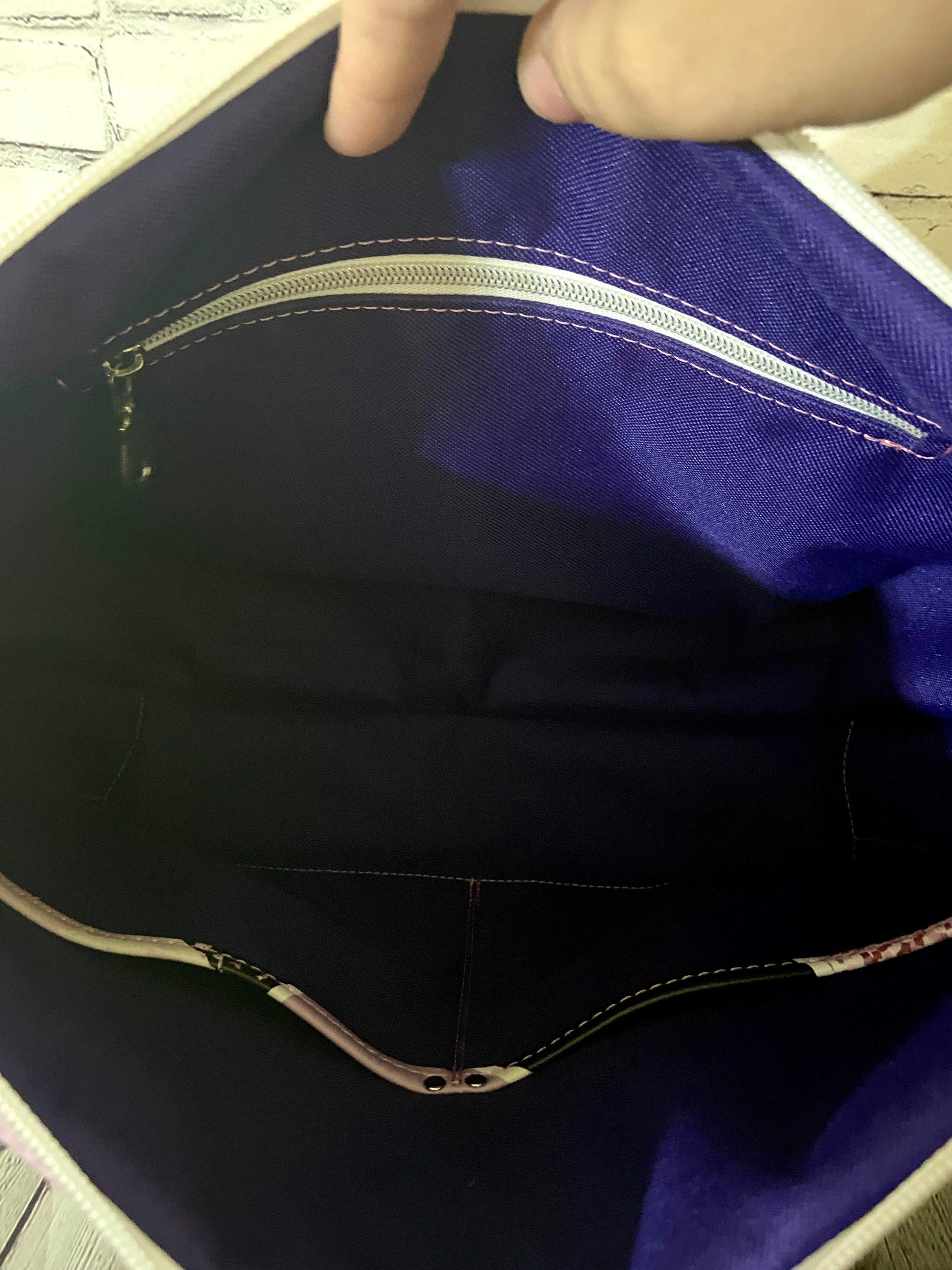 This simple and pretty tote bag is perfect for your simple everyday carrying needs. Made with black faux leather paired with a fun triangle print. Featuring silver hardware, cute heart shaped zipper pull, and long straps for comfortable carrying. Lined inside with purple waterproof canvas. Also inside are two slip pockets and one large zipper pocket. This bag is simple and pretty!