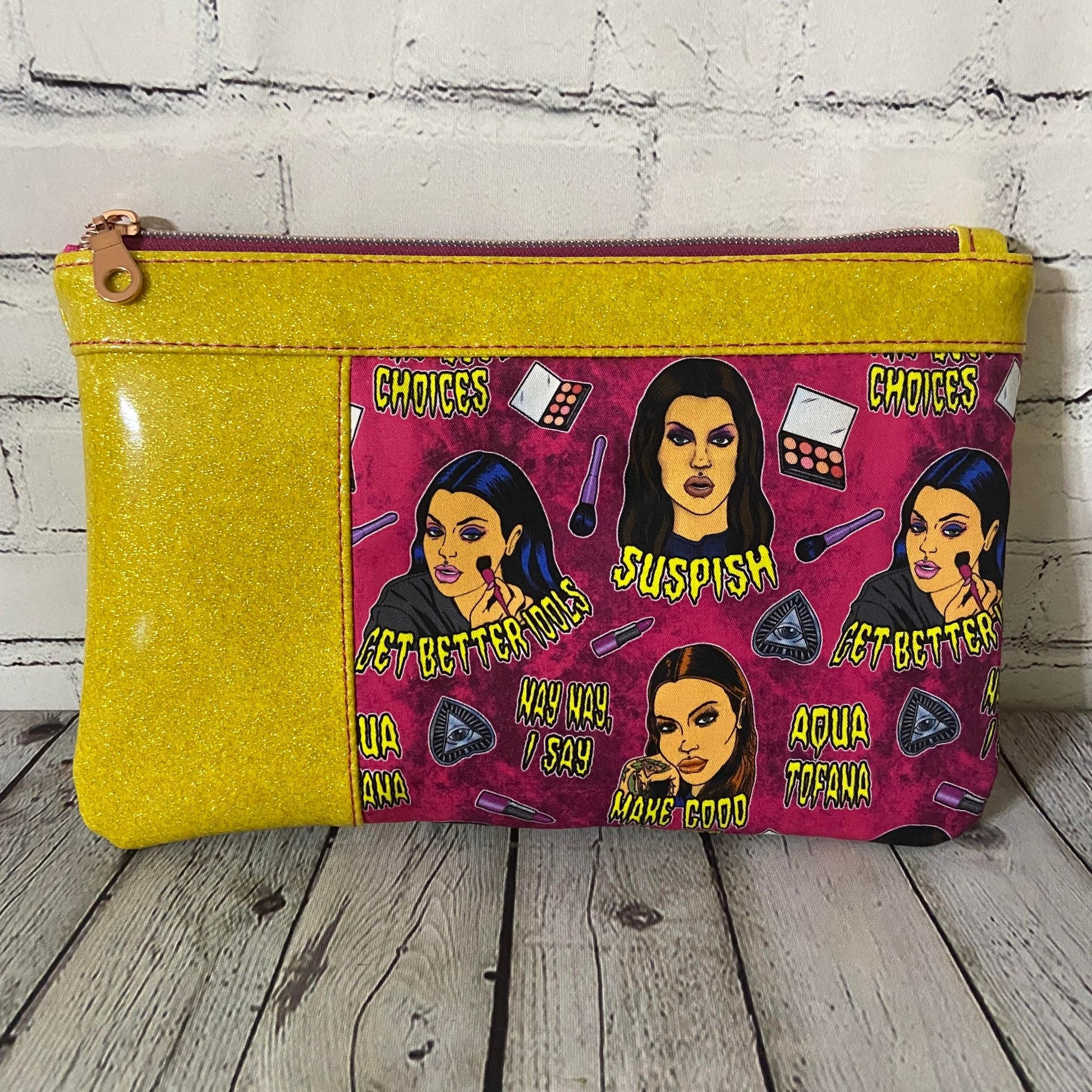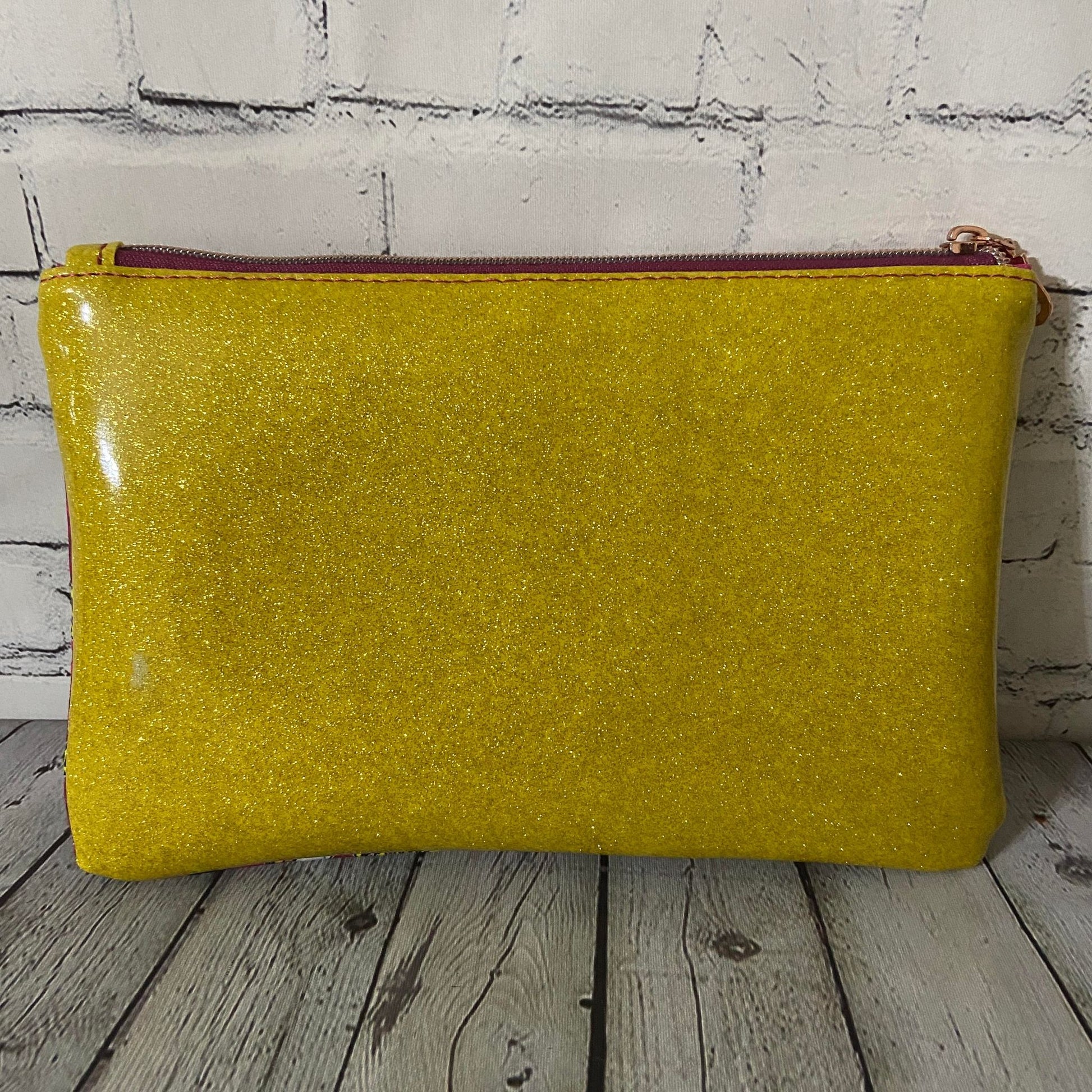 For Murder, Mystery and Makeup lovers! This clutch was created with yellow glitter vinyl paired with a pop of Bailey inspired fabric and rose gold hardware. Don't worry, the glitter is fully sealed in and not going to rub off onto things or fade. Lined inside with hot pink waterproof canvas. Waterproof canvas is perfect for lining cosmetic bags. It is sturdy, vibrant colored and you can easily clean the material with a damp cloth.